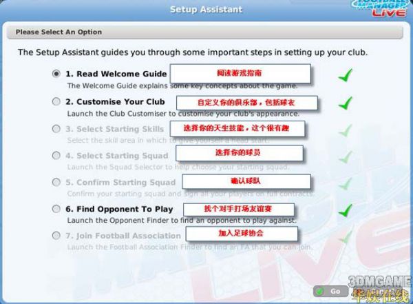 当你进入游戏后,首先会看到的是这个界面,建议按照游戏的指南一步步进行。同时在游戏开始时,你可以定制你的队伍队名和Logo。为了保证游戏公平和后来者的生存及发展空间,游戏中的球员会有一部分被锁定,以便保证后注册的经理同样能够选择到好球员。所以基本可以放心的是,你不需要一定赶在服务器开放的时候加入,只要在赛季开始前加入就可以,有很多-10潜力的小牛是别人选不走的。