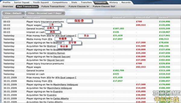 5. 出售球员的收入,这点会在之后的转会系统中详细说明,简单点来说,游戏对于在一定时间内过早出售球员会征收最高100%的盈利税