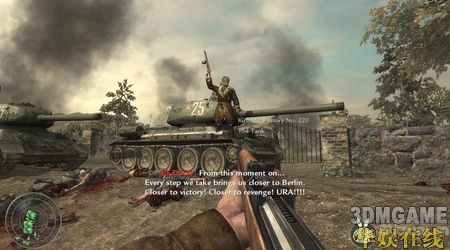 消灭完坦克后再次来到一个屋子里,里面有一把重机枪,走出屋子后会有几辆己军的坦克驶过,跑过去按F是可以爬上坦克的。跟随坦克来到敌人的阵地,借助手雷和重机枪硬杀进去。沿路又可以捡到火箭筒,这里火力很猛,只要多运用火箭筒就可以了,比较简单。一直冲杀过去,杀到一辆坦克旁边,消灭掉所有敌人后本关结束。