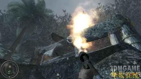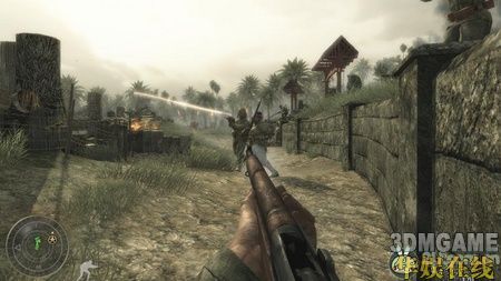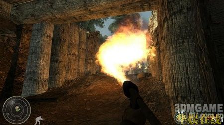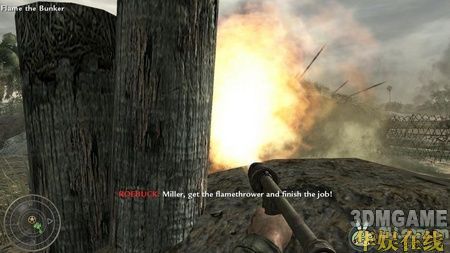 这关开始你就拿着火焰喷射器,跟着友军往前冲,草丛中隐藏着很多伪装了的敌人,喷火,烧死他们。接着从地堡右边的一个路口冲杀进去,用手榴弹配合火焰喷射器就可以解决掉这里的敌人。接着走过去会有任务提示你捡起炸弹炸掉敌人的房屋。先杀掉房屋周围的敌人,然后再捡炸弹扔进去,自己跑开后再引爆。攻击这边的敌人火焰喷射器比较好用。