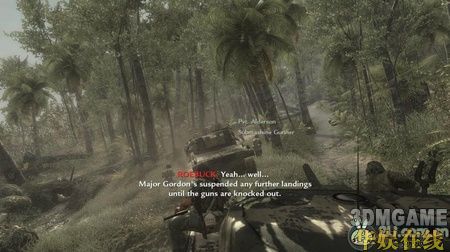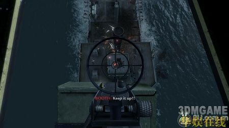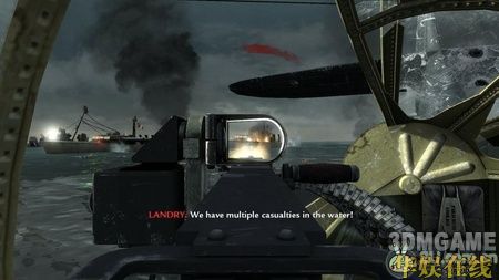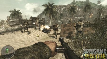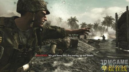 这关一开始便是坐在水陆两用运输车上,跟着友军的坦克部队向岸边冲去。在岸边,车被打沉,任务开始。这时会有任务提示你呼叫火力支援,按6呼叫后方的友军火炮炸掉岸边的火力点,然后跟着队友一起往前冲,时刻注意不要冲到队伍的前方。往前走,会看到几个小暗堡,躲在掩体后消灭掉暗堡及附近的敌人,然后冲进壕沟,多往壕沟里的木箱后面躲,汽油桶就别躲了,会爆炸的……