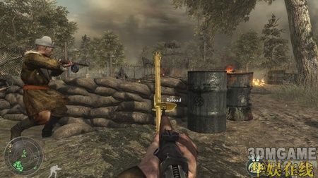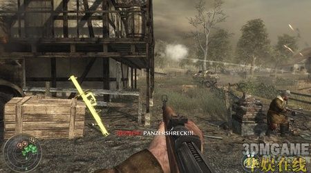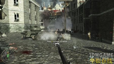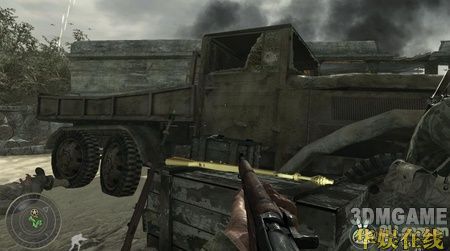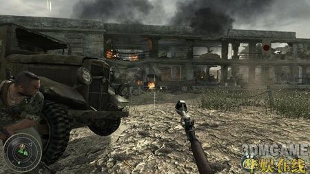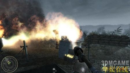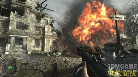 一开始只需要跟着队友往前走,在一架坠落的飞机处会冲出小波敌军,相信这时的你已经可以轻松的应对了,当然还是要提醒你,尽量站在队伍的后面。继续向前,在敌人的一处阵地展开对战,敌人有几处暗堡,打的时候一定要小心。在暗堡的旁边会有一个火焰喷射兵死掉,拿起他的火焰喷射器,这可是个不错的武器,用它来解决暗堡里的敌人非常好使。清光暗堡的敌人后冲进暗堡里的隧道,小心的通过隧道继续前进,在前面会碰到一个敌人镇守的破楼,小心的绕到破楼左边的一辆卡车处,这里可以拿到流弹(按数字键5使用),流弹威力很强,很快便可以清光这里的敌人。