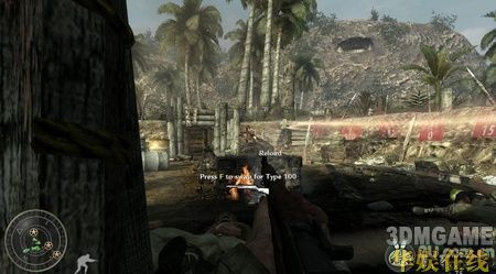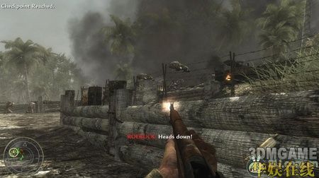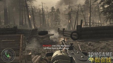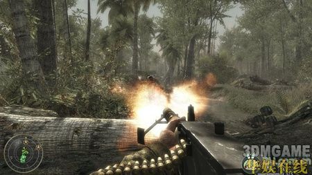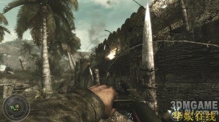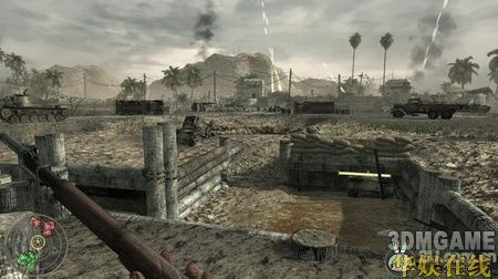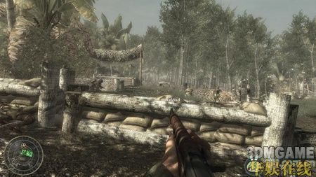 一开始你就拿着一个火焰喷射器,先扔烟雾弹来掩护,然后就使劲喷火吧,近战消灭敌人这东西非常好用。沿路再次杀进一条壕沟,壕沟有不少敌人,打的时候要小心,很多拐角处都会有敌人突然冲出来,要时刻保持警觉。而且壕沟旁边的树上面也经常会有敌人,他们躲的很隐蔽,要小心他们。在壕沟里面敌人的一个火力掩护点里面会有三挺机枪,杀掉里面的敌人后可以使用。