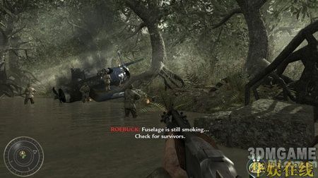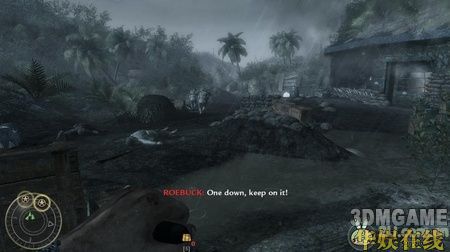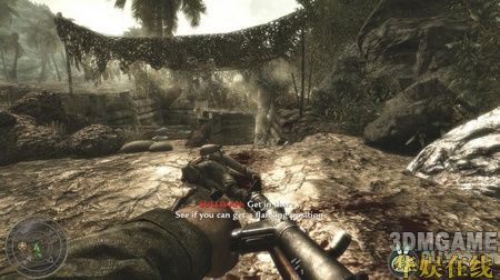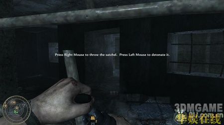 在一个大下坡处再次与敌人碰面,这里一定要先消灭掉小屋里的那个重机枪手,那可是个超强的火力输出。轻松消灭敌人后沿水流一直走到一处破房子的旁边,走进小房子后突然会有闪光弹猛闪一下,敌人会趁着闪光冲出来,这时尽量多的躲在房子里,以房子为掩体,消灭掉外面的敌人。注意敌人会经常扔来手雷,看到有手雷的提示后一定要快速闪开,手雷基本上都是一击必杀的。跟着队友一路往前杀过去,很快就会看到一辆车,车上有个大汽油桶,走过去按F键扎破汽油桶,车会冲过去撞到敌人的建筑,趁乱杀掉敌军。靠左边走,会走到一个地下的小指挥中心,启动里面的炸药包,然后立刻往外撤,接着炸药包爆炸,出现剧情,本关结束。