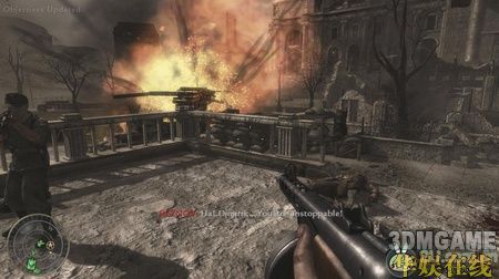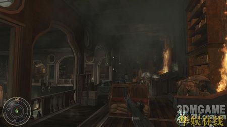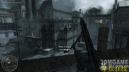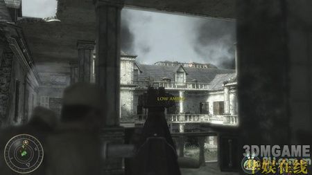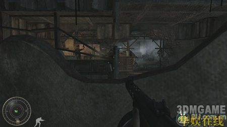 然后友军会带着你从一个小门绕下来,下面大厅中出现很多敌人,用狙击枪射击敌人背上的火焰喷射器,火焰喷射器的爆炸可以帮你解决掉很多敌人。解决完大厅的敌人后,跟着友军推开小门冲上了大厅二楼的左边,这里用狙击枪可以很轻松的解决掉对面的敌人。然后就冲到了大楼的顶层,先躲在墙角用狙击消灭掉敌军的火力点,然后换冲锋枪杀掉剩余的敌军。