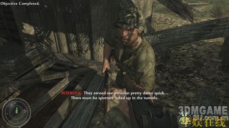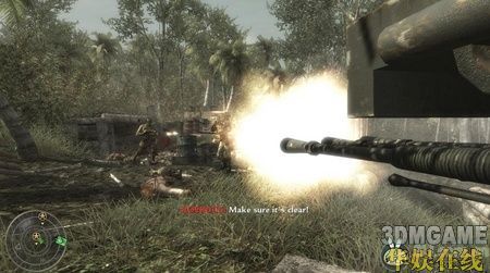 按照任务提示炸掉所有房屋后,跟着坦克冲到一处敌人阵地,这里要小心树上,敌人有时会躲在树上。沿路杀过去,有一个小地堡,用火焰喷射器对着里面喷一下就可以解决掉里面的敌人,接着冲进地堡,消灭掉里面的敌人,进入地下的隧道,沿路有很多敌人,全部杀掉,一直走到隧道的最深处会看到一个梯子,小心的爬上去,迅速杀掉上面的敌人后触发剧情,本关结束。