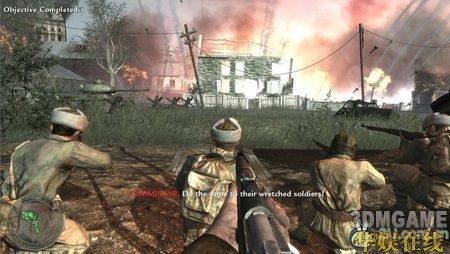 再往前是几间着火的房屋,这里会冲出好几个用刺刀攻击的敌军,记住,边退边打,防止被他们近身。沿路走过去会有很多隐藏着的敌人,小心的确定他们的位置,再用狙击搞定他们。借助喷火坦克的掩护,走到一个敌人修建的地下隧道,跟在队友的后面杀进去,干掉所有敌军后,友军放出信号弹,任务结束。