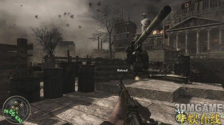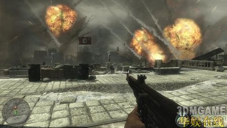 剧情过后跟着队伍往前冲,这时的战斗比较乱,冲的时候走慢一点。敌人扔的手榴弹越来越多,经过了前面的战斗相信你也应该可以灵活的躲过了。一直走穿过一个敌军驻守的房子,然后跟着队友来到一个残破的场,广场中有几挺重炮,走过去启动炸弹,挨个炸掉它们,然后消灭掉广场周围的敌军。在广场周围共有4处巨炮,一定要挨个走过去启动它们下面的炸弹,启动炸弹后需要立刻躲开,靠太近的话自己也会被炸死。