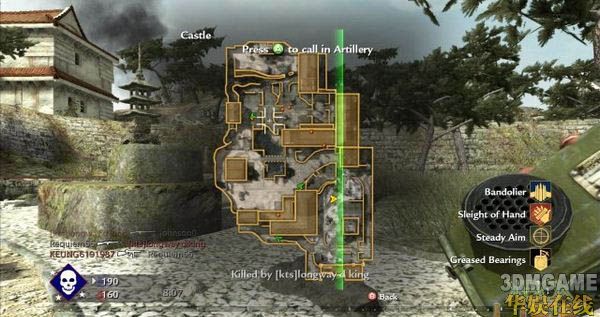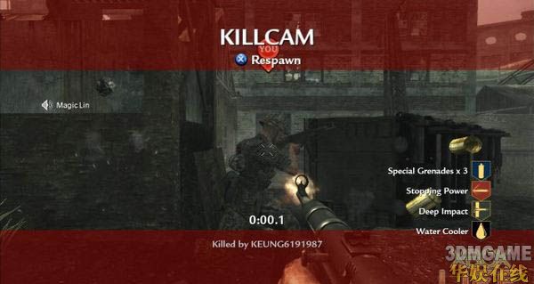 另外《COD5》每次死亡后会出现数秒的重播画面,也就是所谓的<KILLCAM>,内容就是你被射杀时对方视角的重播画面,这段画面可以按X跳过,但如果你不确定自己是怎麽死的,建议还是花点时间看一下,一来检讨自己的问题,另外可以提供敌方躲藏的位置,尤其是狙击手或是龟派传人的埋伏点。