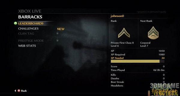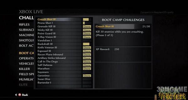 经验值计算基本上只有公开战局有计算,Private私人自订战局则不计算XP成绩,经验值称为XP,以<Team Deathmatch>来说,杀1人10分,若是对敌人造成伤害,但最终是由其他队友击毙此敌人,则记助攻一次,依据你对该敌人的伤害值记2分到8分不等,战局结束另有<Match Bonus>额外添加战局积分,游戏中另有称为<Challenges>的挑战积分,在战局中达成某些特定条件也可以得到游戏设定的挑战积分,譬如说步枪累积杀25人有100分、100人500分、150人1000分,所以练枪算是快速累积经验值的最好方法,另外蹲著击毙敌人,趴著都是有挑战积分计算的。
