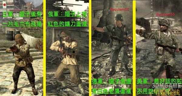 各国军服的差异,另外游戏中拿狙击枪的敌人算是独树一格,都是有伪装在身的。
