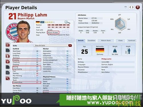我一直用开的队伍是Bayern Munich~原因是左右后卫 中场都达到我心中的标准~例如: Philipp Lahm