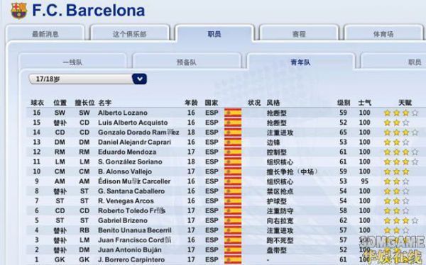 青年队4个年龄段的球队都可以察看 点选左上角的17/18 在下拉菜单中选择 (好意外 我又出五星了 嘿嘿)