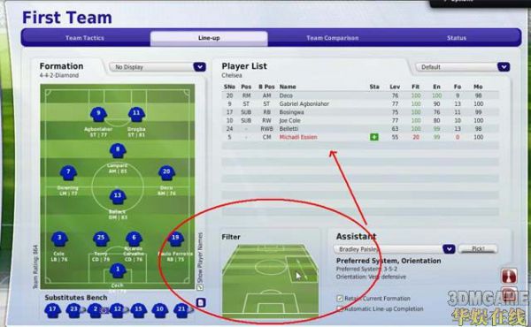 图中箭头所指的队员就是目前选定区域里面的位置偏好球员,说明在比赛中球员已经适应这个位置,方便玩家选择为了稳固防守,在门将前面的禁区地带,一定要保证足够的人手,偶建议3人以上。