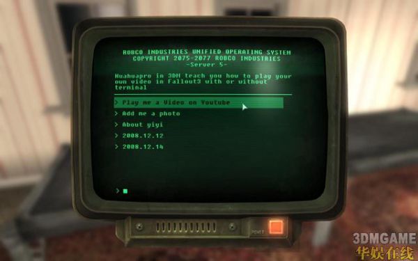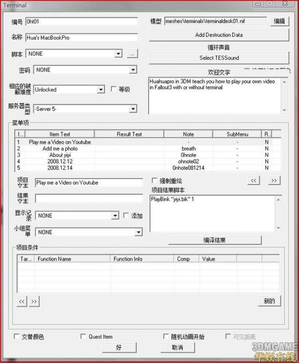 最好的方法其实是把视频“放”在游戏的终端里,我就是这么玩的,在终端里建了一个“youtube”的选项,一按,就可播放你指定的视频。方法是打开并编辑终端(用geck),创建菜单,将指定的菜单的end script里面写上PlayBink "MyNew.bik"就可以了。