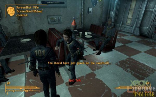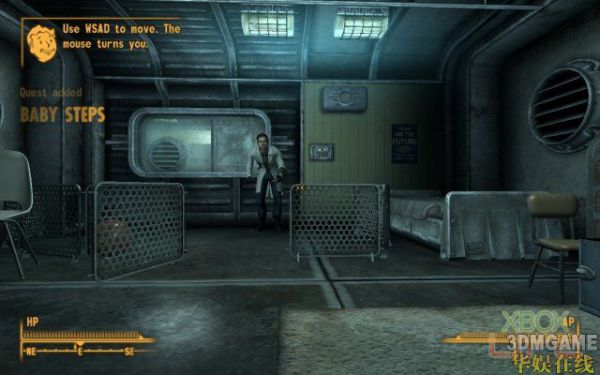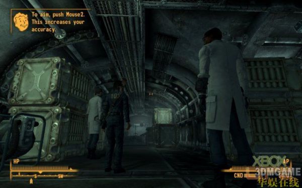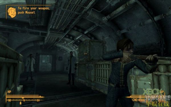 穿过了闸门,我来到前廊,我听见有两个人在厅内谈话。他们似乎正谈论着Vault的溷乱,正想要离开。其中一个叫Tom的,往外面的门廊跑去。突然间,我听见了枪声!是警卫射杀了Tom!另一个女人跑了过去,同样也被射杀了。我躲了起来,准备面对接下来可能发生的战斗。已经全面失控了,为什麽会这样?难道是Overseer下了什麽命令吗?还有满地的大蟑螂,老奶奶死在酒吧内,这一切会是谁造成的?