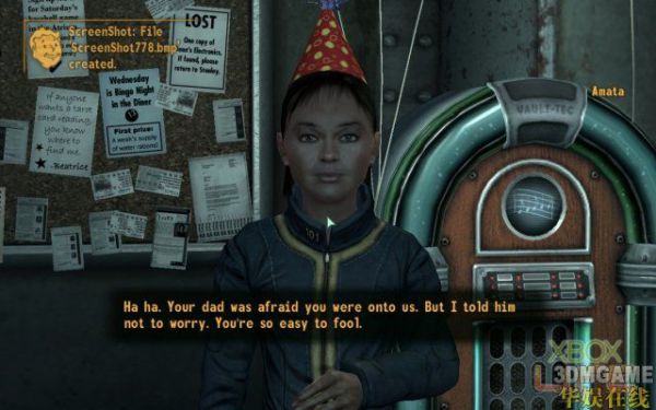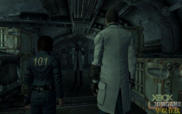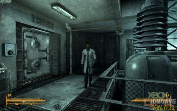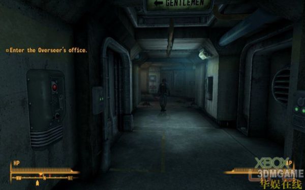 Amata叫我快点离开,她会在出口追上我的。我在房间内找到了Overseer的钥匙,用它打开了外面的门后,进了Overseer的主控室,主控室的柜子内有电脑终端机密码,我用这个密码启动了终端机,裡面有不少资料。我把他们快速浏览过一遍。原来Overseer曾经派人到外面的世界探查过,其中几份是关于外面世界的报告。有个城,似乎叫做Megaton,在几份报告内都提到过。这些资料显然很重要,我把他们输入到我的Pip-Boy内。我操作终端机,要打开了秘密通道,接着Overseer的主控台开启了,那是一个往下的通道。我往下走,穿过了几道门,来到一扇超厚齿轮型钢板闸门前,在旁边有个控制台,我按下了上面的开关,开门程序启动了!但它也导致警铃大作。