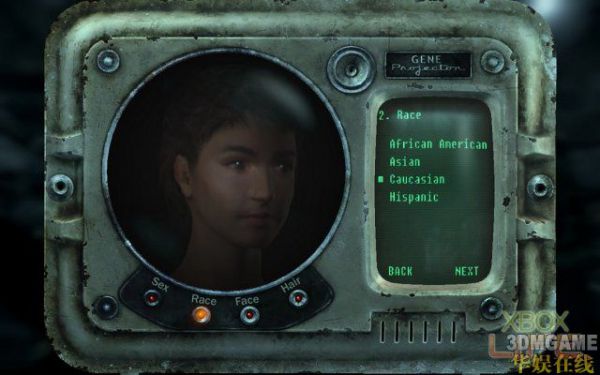 (这是调整脸部模型的时候了,还可以在这裡改变性别,如果想看看男性和女性的长相再选择扮演的性别,这是个很好的时机。左边的画面是脸部的预览,在脸部预览下方有四颗按钮,分别是切换「性别」、「种族」、「脸」、「头髮」的功能按钮。在脸部预览画面可以旋转面向角度,方便观看头型的各个角度。你可以依偏好慢慢调整。Vault科技并不赶时间!)