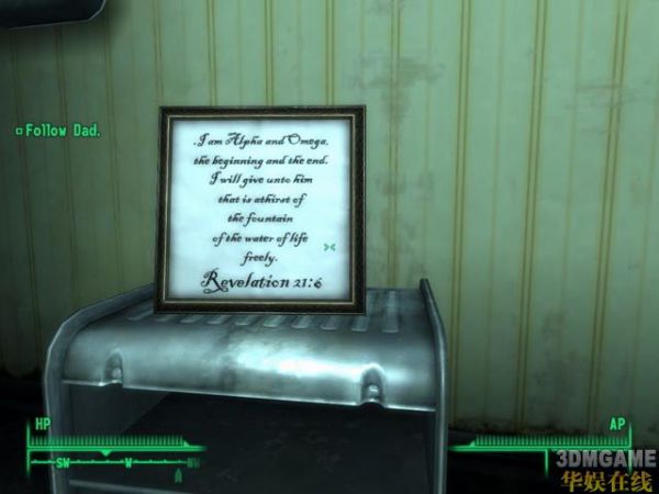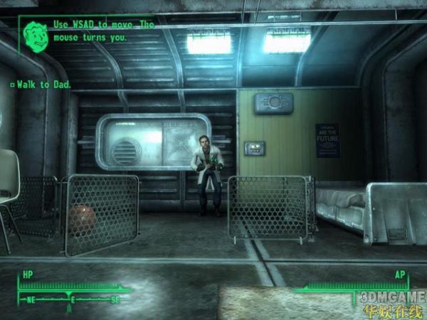 3、看看这个父亲,一定是个好父亲,小孩的一声声 Daddy 真让人怜爱!走近了又是一翻对母亲的回顾,“…才一岁就跑得和兄弟一样,你母亲会非常骄傲的”,这个男人不忘旧,好男人,这么看来Vault101里面成年男性相互都称“兄弟”(bro);和父亲说说话,这小孩还不太会说话,管爸爸叫“vava”提示写得很明白,WASD移动,鼠标旋转方向,左SHIFT切换走路和跑步。任务有提示,不错的地方!(怎么心里有种怪感觉?)