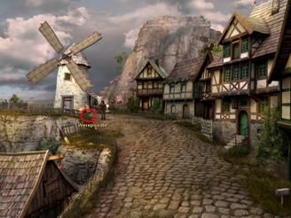 用地图到有风车的磨坊road to the mill,跟marlene和她身后的小狗werepoodle交谈,再观察从左数第二间房子dump知道是属于jorog的。用地图回town hall square,进入小旅店跟olof交谈,租一个房间后上楼去休息了。再下楼时天已经黑了,到了晚上。观察一下诅咒对这个小镇上的影响。