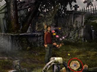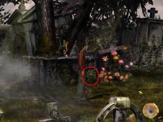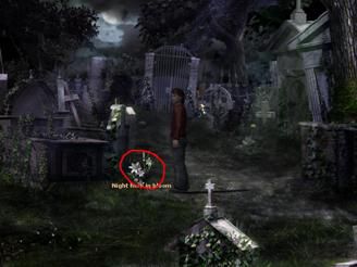 用地图到右下角的墓地cemetery,一直往右走在一丛花的左边拨一把草st.john’s wort,观察花丛后面的墓碑anonymous grave。回到左边,在墓碑前有一束还没开的花,转换成夜晚后花开了拨下它得到night herb in bloom,这时月亮出来了,在月亮上使用月光灯,灯被点亮了。