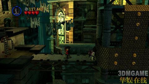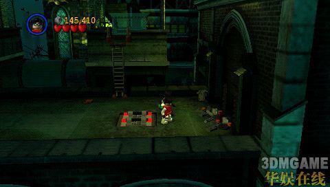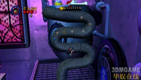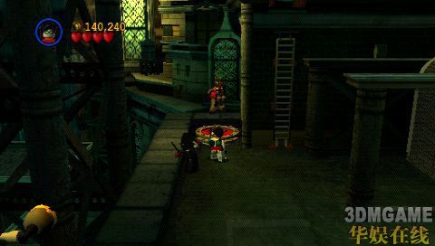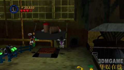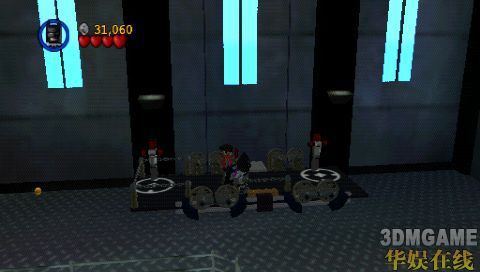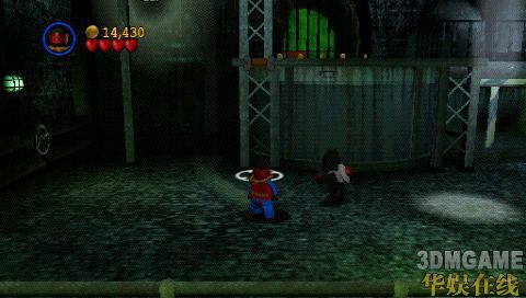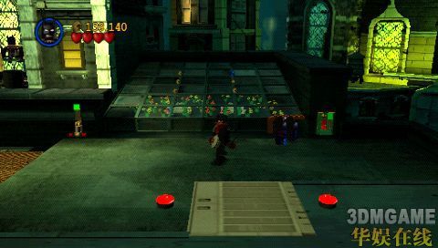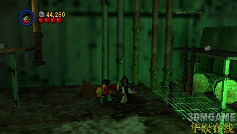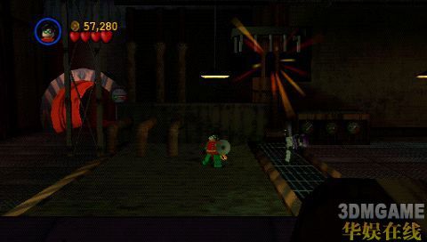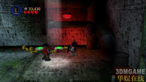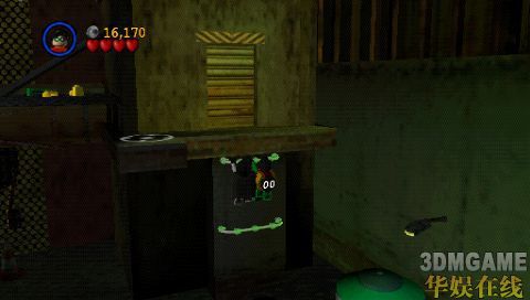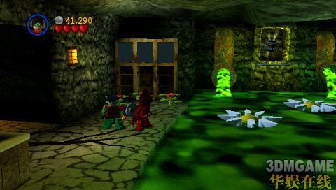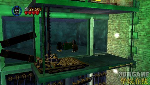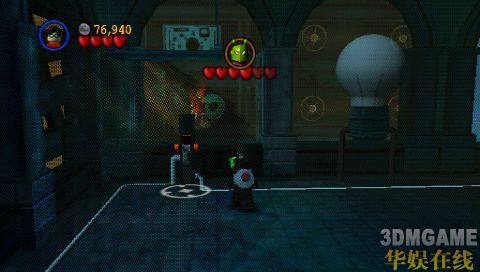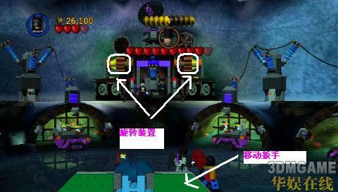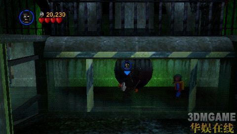 跑到右边水池后爬上平台,把积木搭成一个圆形开关,并不断对开关进行上下踩动,直到把池中的水抽干为止。之后换成Batman经过水池,在中央附近把墙上的黑色圆盘炸掉,显出一个入口,进入。