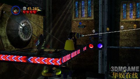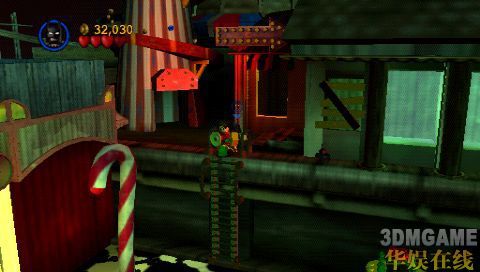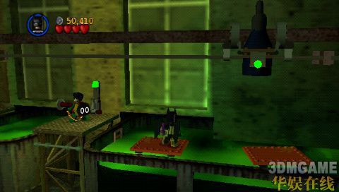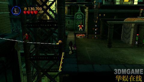 接着来到右边,将地上的积木搭成齿轮吊绳后上去,让Batman飞到对面后踩下圆形开关,装置会敲打叮当,使小丑掉下。