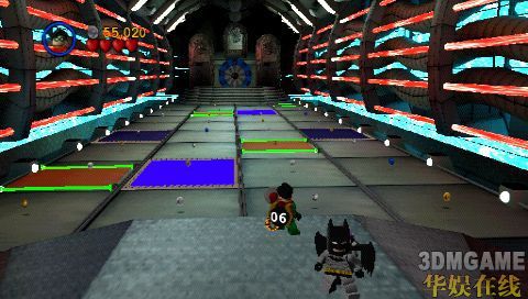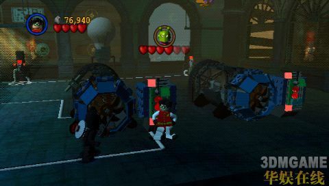 跑到尽头左拐,让Batman换上Sonic Suit。随后把大厅前的玻璃打碎后进入,把里面的积木搭成服饰装置,让Robin换上Magnet Suit。