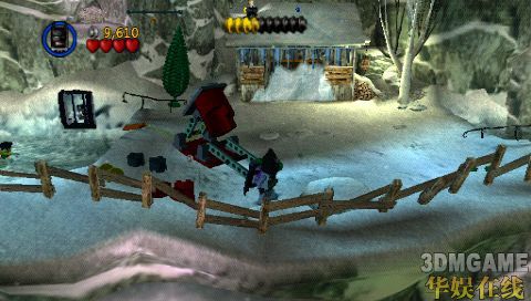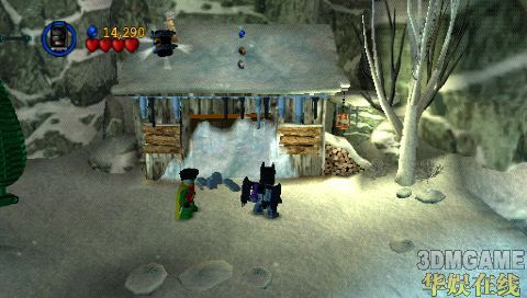 这次的地点变换到了雪地中。前方左边有积木可以搭建成梯子,上去后让Batman换上Glide Suit。然后飞过断桥,打碎小的道具后把积木搭好,随后不断踩下绿色的圆形按钮,不久会掉处一个黄色的小船,Robin借助小船就可以上岸。