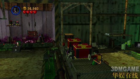 跳过中间缺口后,打碎门前的栅栏进入,把屋子内的所有箱子都打碎,拼成一个移动扳手后,让Batman站到外边的升降机上,随后由Robin转动扳手上去,换成Demolition Suit。