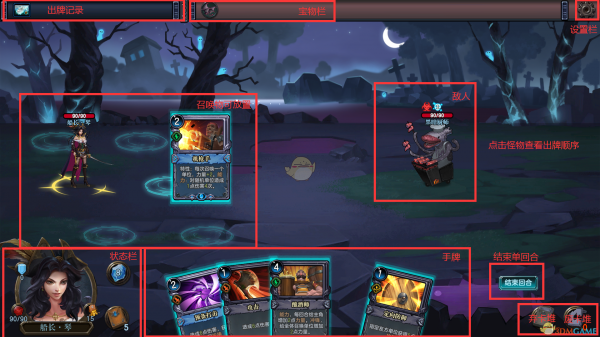 界面左上角是出牌记录,右侧是宝物栏,最右侧是设置栏,里面可以调整游戏的分辨率等。出牌记录下方红框中就是玩家的角色以及可召唤物放置区域。最左下角是玩家的状态栏,包括可用费用以及血量。右侧是玩家所拥有的手牌。敌人就位于牌堆上方。