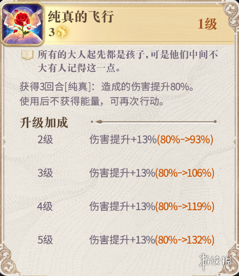 《小王子》小王子的大招本身没有任何伤害,是一个buff,这是小王子具有超高输出的关键技能,也是小王子的输出方式与其他幻书不同的地方,这样的输出方式,使小王子不像其他幻书,释放一次技能后,需要几个回合回复能量,这就是小王子的输出为什么这么稳定且持续的原因。再加上第二个技能,也是一个普攻叠buff,增伤的技能,最高可以增加30%的伤害。这两个技能的buff叠加,使小王子普攻输出也能打出不俗的伤害,但真正要做到“普攻点名,点谁谁死”的效果,还需要佩戴合适的契印纹。