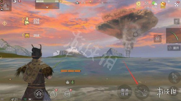4、再点击标注位置抛出鱼竿,随后等待一段时间。
