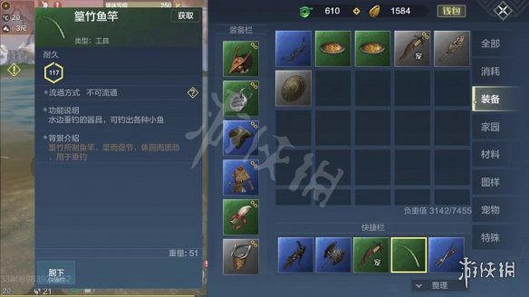 3、然后在快捷装备栏中点击钓鱼竿,点击持有状态。