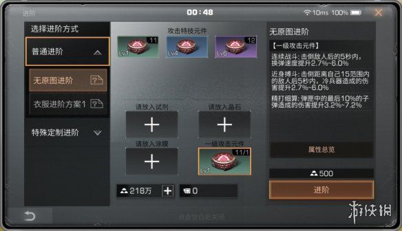 元件进阶在不同类型的装备上,所能研发出的特技是不同的。且不同等级的攻击元件,需要达到相应战斗熟练度才可解锁使用。级别越高的进阶材料,所产生的特技属性效果越好。