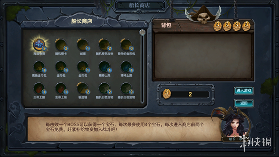 每击败一个BOSS可以获得一个宝石,每次最多使用4个宝石。每次进入商店前两个宝石免费,永久有效。