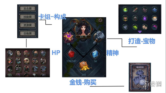 卡牌:包含攻击、技能、资源、召唤、诅咒五种,是游戏主要策略点,可通过战斗和事件、商店获得。