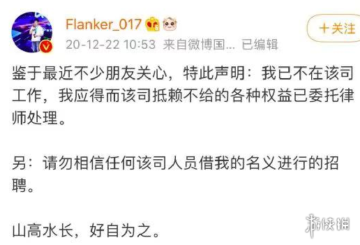 但在2020年12月22日,Flanker于微博发布声明称:“我已经不在该司工作,我应得而该司抵赖不给的各种权益已委托律师处理。”