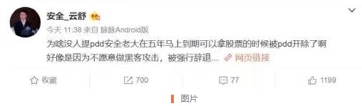结合云舒、sunwear等安全专家表示,Flanker被拼多多辞退应该是因为其不愿意从事“黑客攻击”,而他被开除前任期即将满5年,届时将有权获得该公司价值上亿的股票。