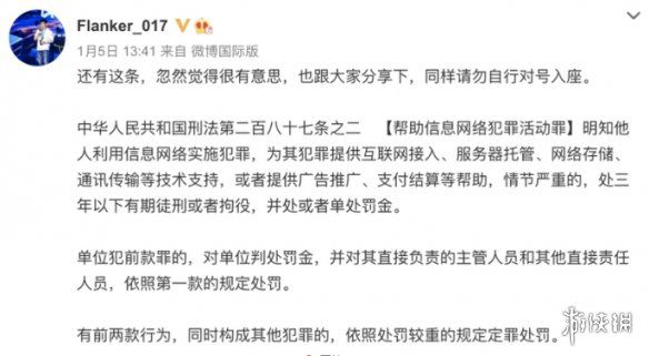 2021年1月5日,Flanker连发三条微博,内容涉及“帮助信息网络犯罪活动罪”。