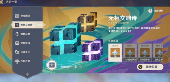 无相交响诗活动一共持续14天,从今天开始算,每天开放一个阶段的挑战,共7个阶段挑战,所有的阶段挑战加起来一共可获得420原石的奖励。