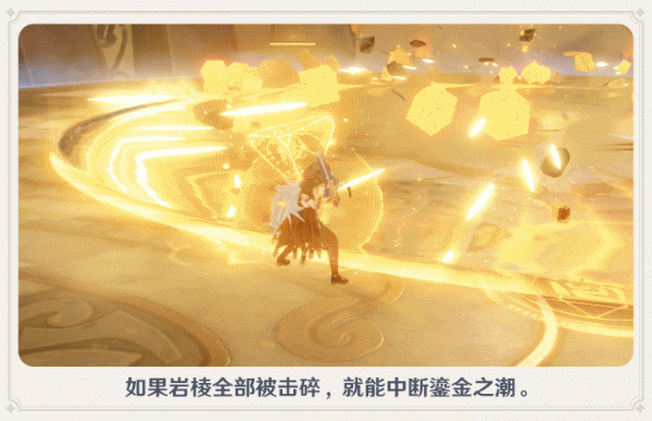 1、在鎏金之潮期间,可以拾取岩柱破坏生成岩元素晶片,为角色提供护盾防护哦~