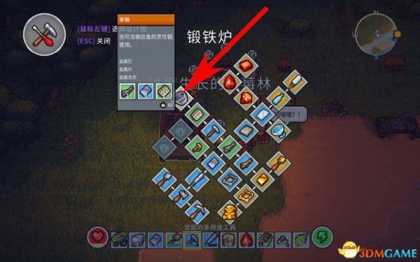 如下图箭头所指,建造锻铁炉,铁钉科技线到头,制作一个铁锅。