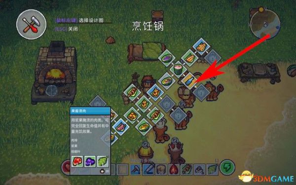 然后按R,工作台科技线到头,解锁烹饪锅,之前制作的铁锅是必需材料。