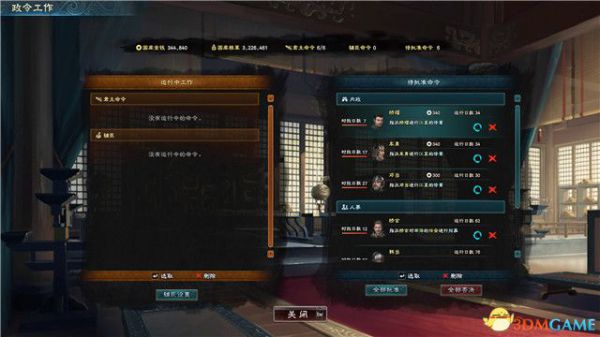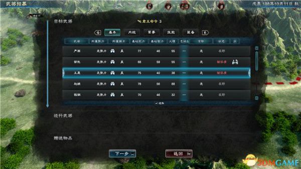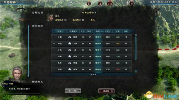 尽可能选择属性较低的武将来做这份工作,虽然一般情况下,属性较低的武将会消耗更长的工作日,但你那些高属性的武将将会用在其它地方。