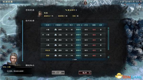 不过你需要遵循这名武将的“忠诚度”,算出大概能将他挖过来的几率以及会消耗的成本代价。
