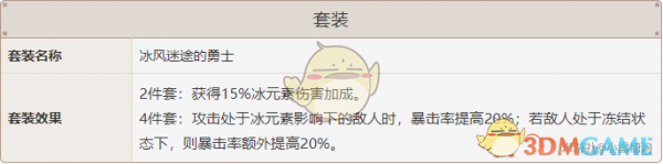 4件套:攻击处于冰元素影响下的敌人时,暴击率提高20%敌人处于冻结状态下,则暴击率额外提高20%。