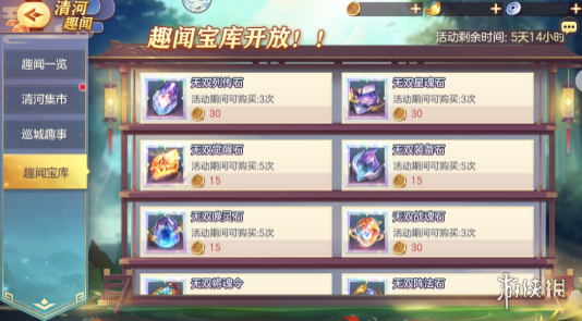 活动期间,趣闻宝库开放!使用趣闻金币即可兑换无双列传石、无双星魂石、无双阵法石、无双将魂令、无双唤灵石、无双觉醒石、无双装备石、无双战魂石、体力食盒、高级神锻石、刻印石等多种资源!