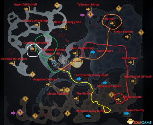 等攒够1000块,就可以去出大地图,往右走去丹佛废墟(见地图,按橙色路线走),如果遇到辐射带从右下的岔道绕过去,进入丹佛,在白宫内找到武器商,可以卖到6级武器,一般700左右一把。