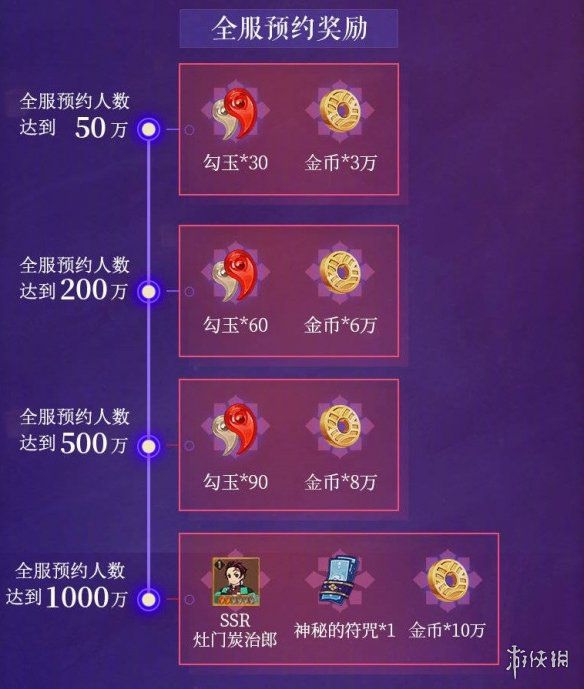 阴阳师大人们可前往官网完成预约,当预约的阴阳师大人总数分别达到50万、200万、500万、1000万时,将免费获得SSR灶门炭治郎契约书等对应梯度的全服预约奖励。